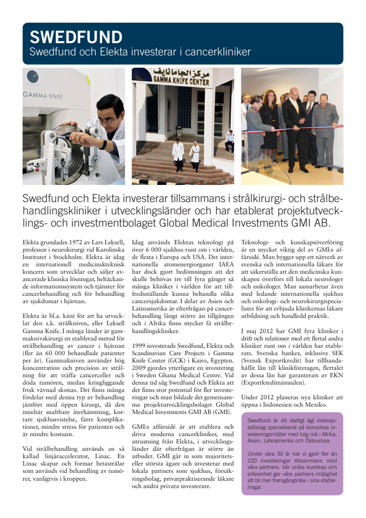 Swedfund och Elekta investerar tillsammans i strålkirurgi- och strålbehandlingskliniker i utvecklingsländer och har etablerat projektutvecklings- och investmentbolaget Global Medical Investments GMI AB.