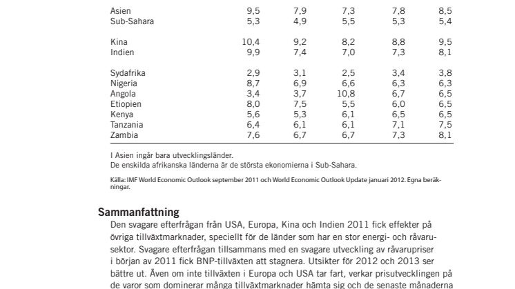 • Tillväxt/utvecklingsmarknader Ekonomisk utblick april 2012